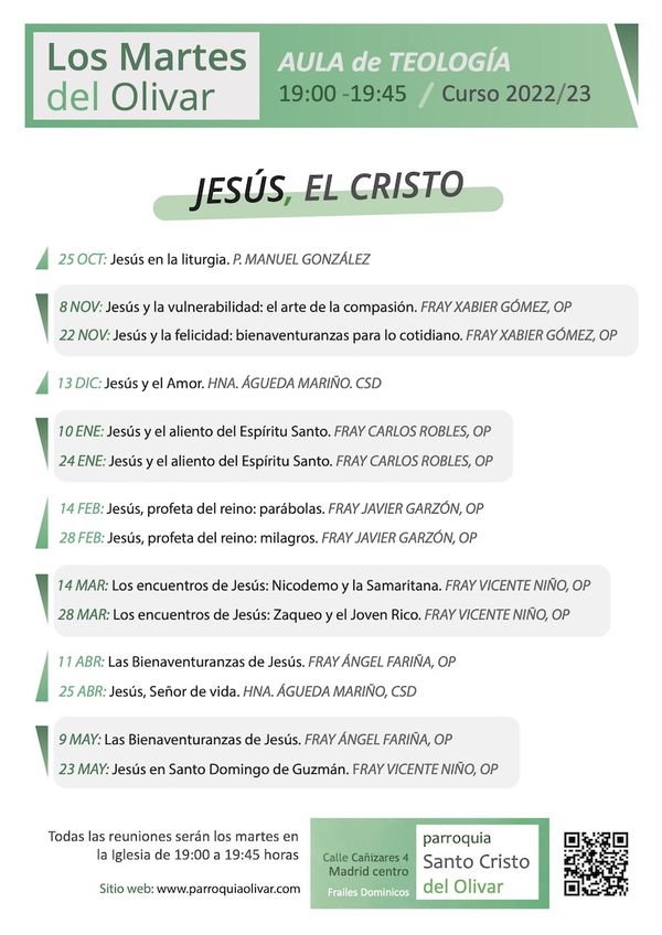 Este martes 25 de octubre ha comenzado el nuevo curso de los Martes del Olivar, el Aula de Teología que los frailes dominicos de la comunidad del Santo Cristo del Olivar vienen ofertando desde hace más de 20 años. Con el mismo hilo conductor que el curso anterior de ahondar en la persona de Jesús de Nazaret, este curso tiene por título Jesús, el Cristo.