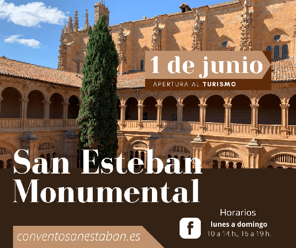 El arte, la cultura y todos los circuitos turísticos empiezan, poco a poco, a retornar a la universitaria ciudad de Salamanca. El monumental e histórico convento de San Esteban, uno de los lugares más emblemáticos de la ciudad, joya del arte renacentista y cuna del derecho internacional, reabre también sus puertas al público, los cuales podrán visitar sus lugares más destacados: el pórtico, el Claustro de Reyes, las salas capitulares, coro, iglesia. El museo y mirador se irán abriendo, paulatinamente, según avancen los meses.