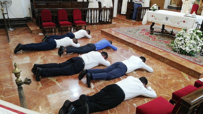 Tras la lectura del Evangelio, los seis novicios fueron convocados por sus nombres para, postrados en el suelo, contestar a la pregunta «¿Qué nos pedís?»: «La misericordia de Dios y la vuestra».